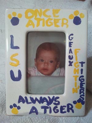 Add your own paint and embellishments to a picture frame for a classic gift with a more personal touch. For this frame, I chose a Louisiana State University theme as a gift for LSU alumni, but any theme will work.